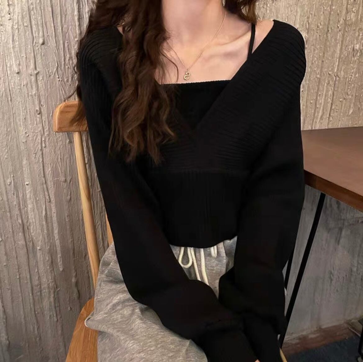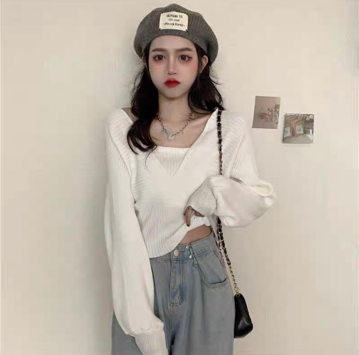全3色/フェイクツーピース スクエアネック パフスリーブニット TO-NT100