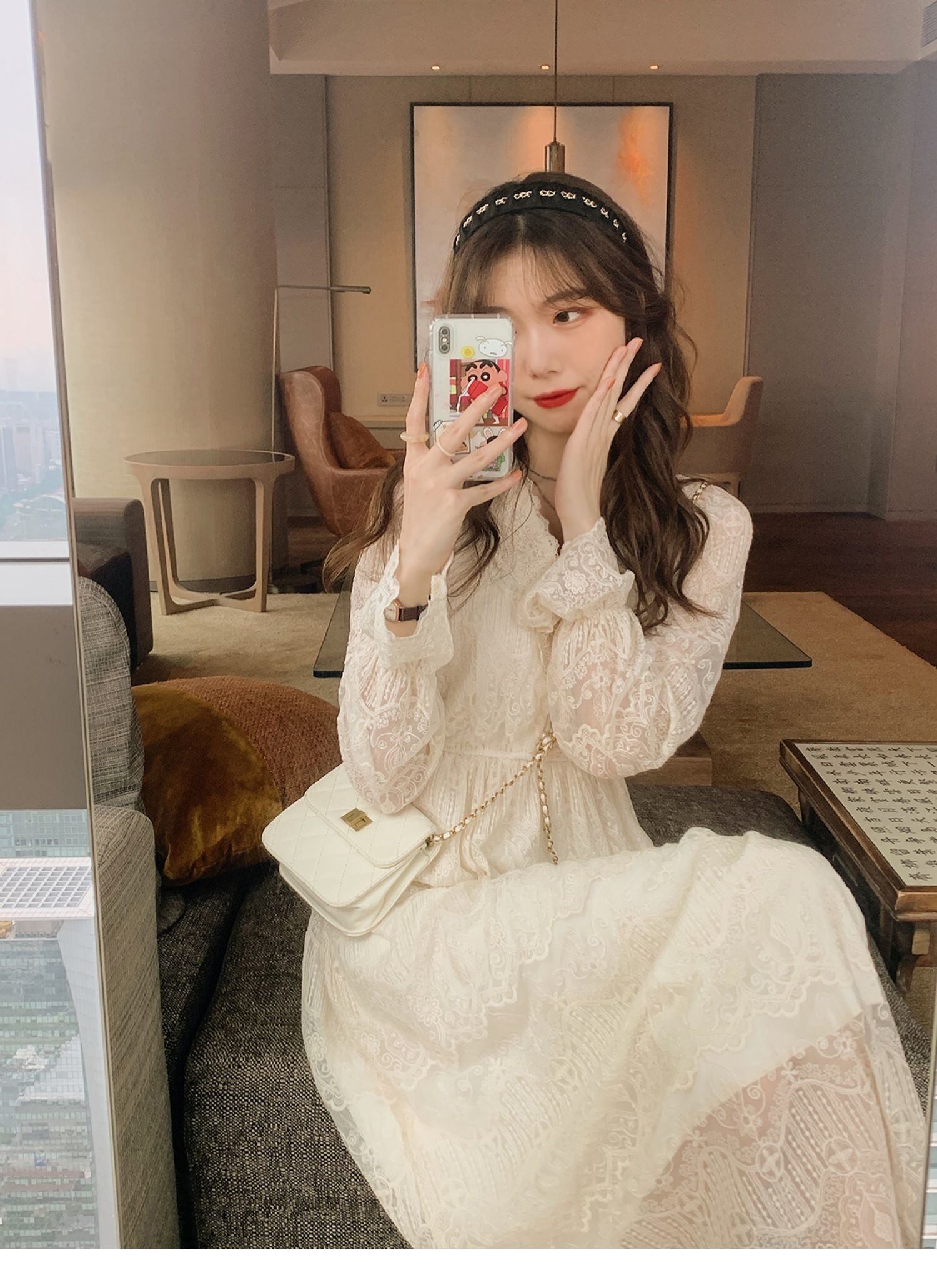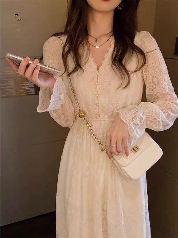 VネックフレンチレースAラインロングワンピース 32M-ONE-043