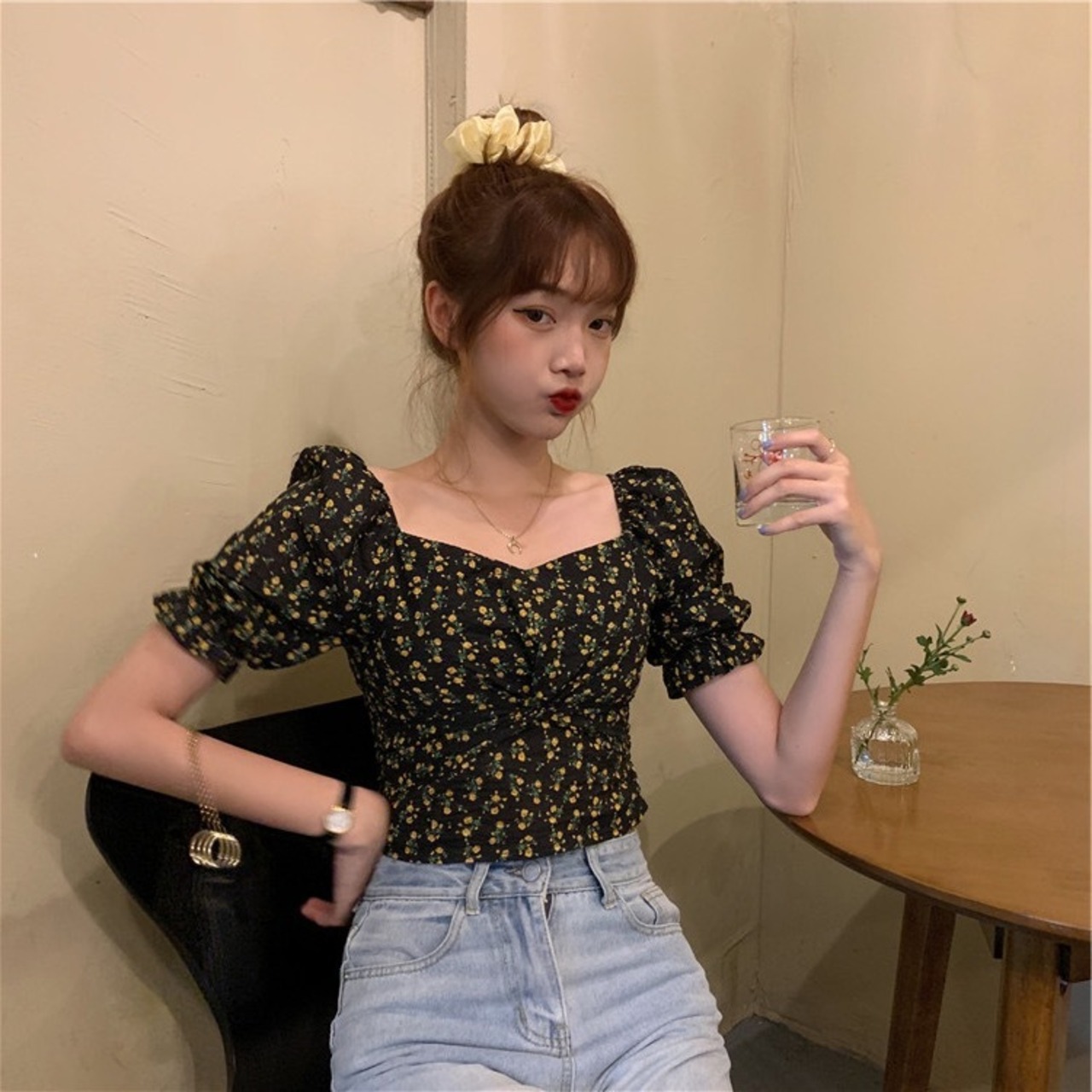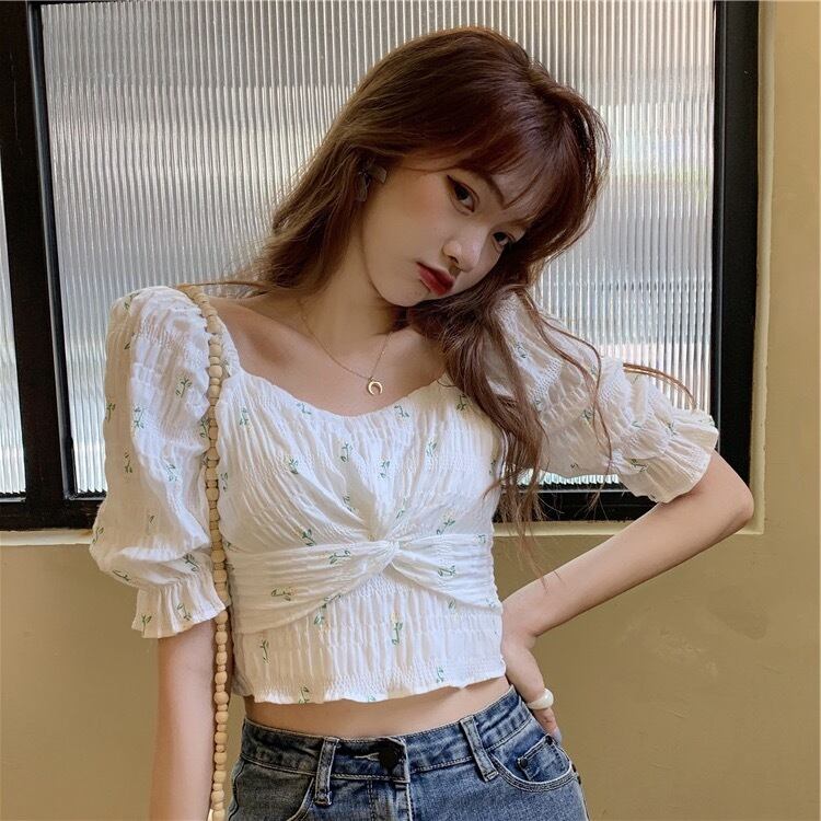 バルーンスリーブダイヤモンドネックフラワークロップドトップス TO-BR700