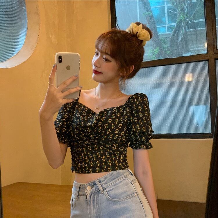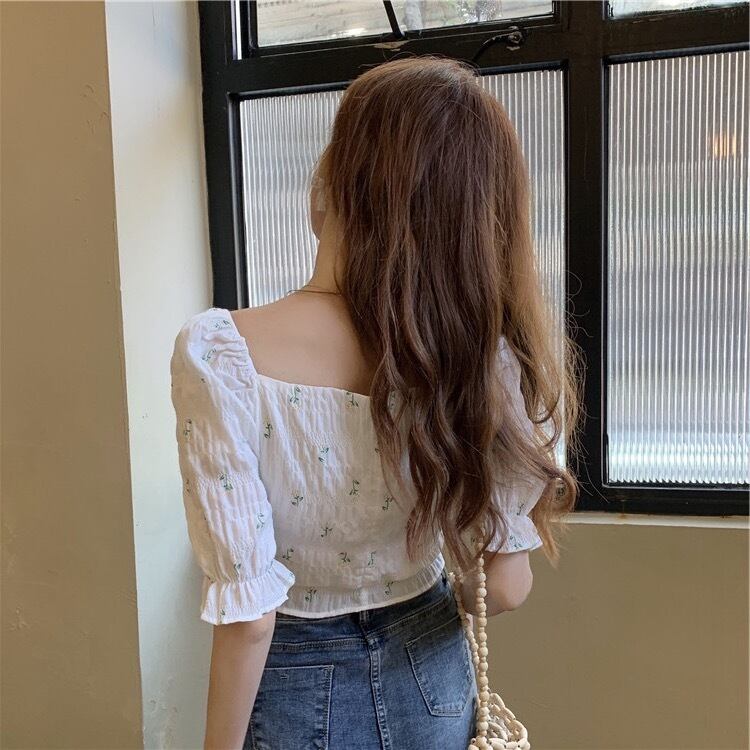 バルーンスリーブダイヤモンドネックフラワークロップドトップス TO-BR702