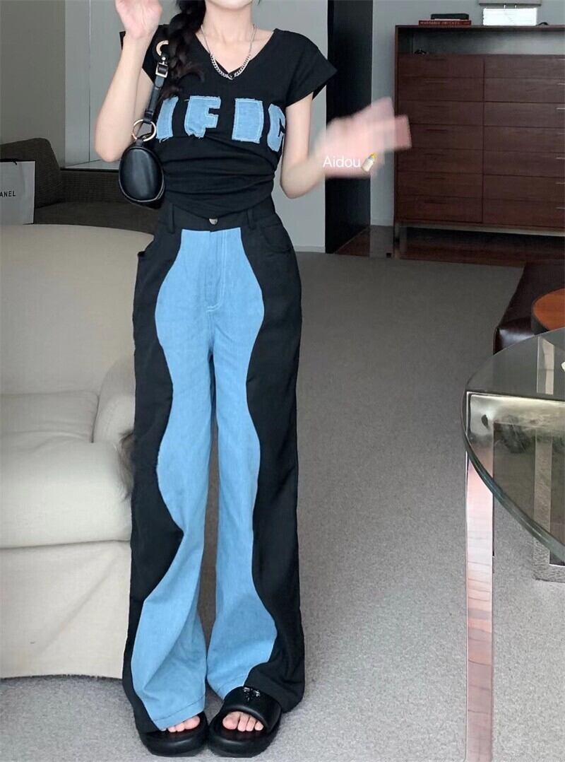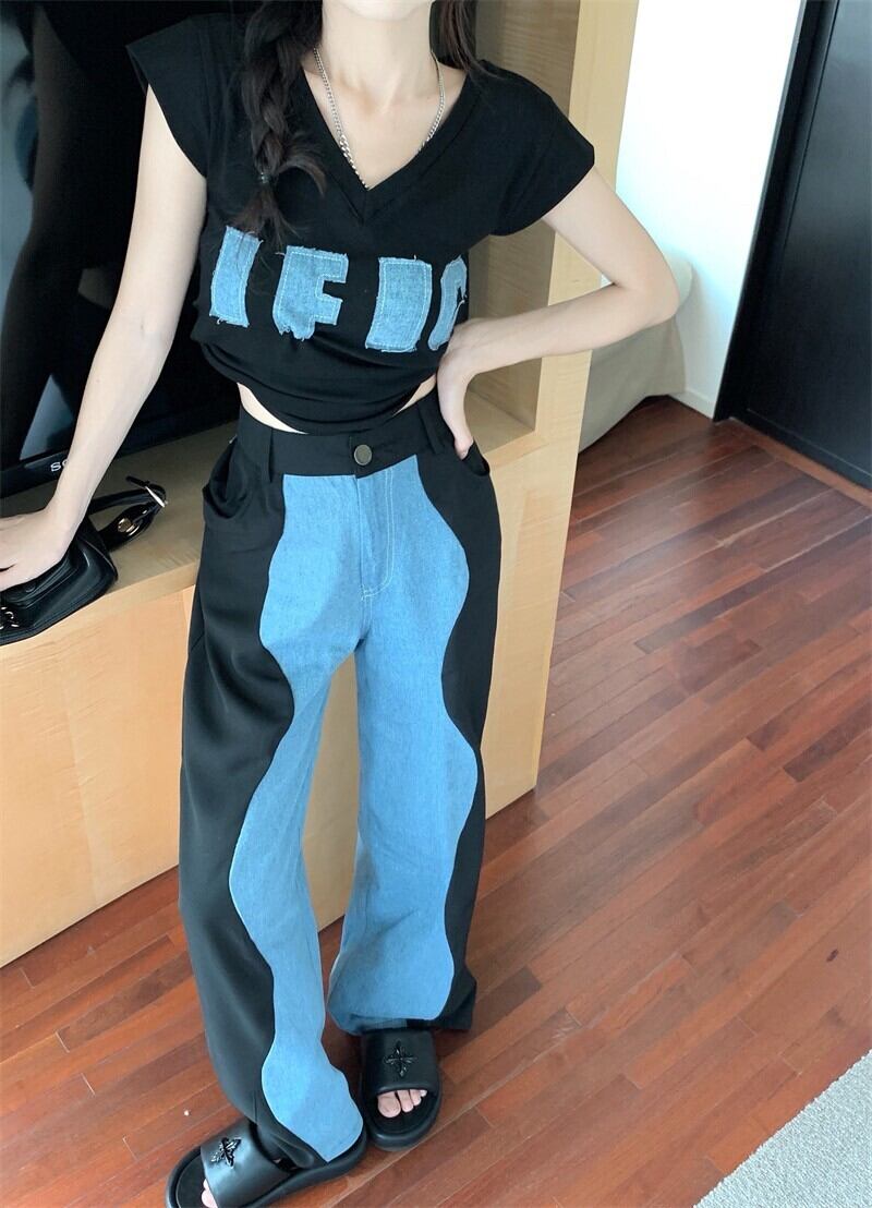 デザインダブルカラーデニムパンツ