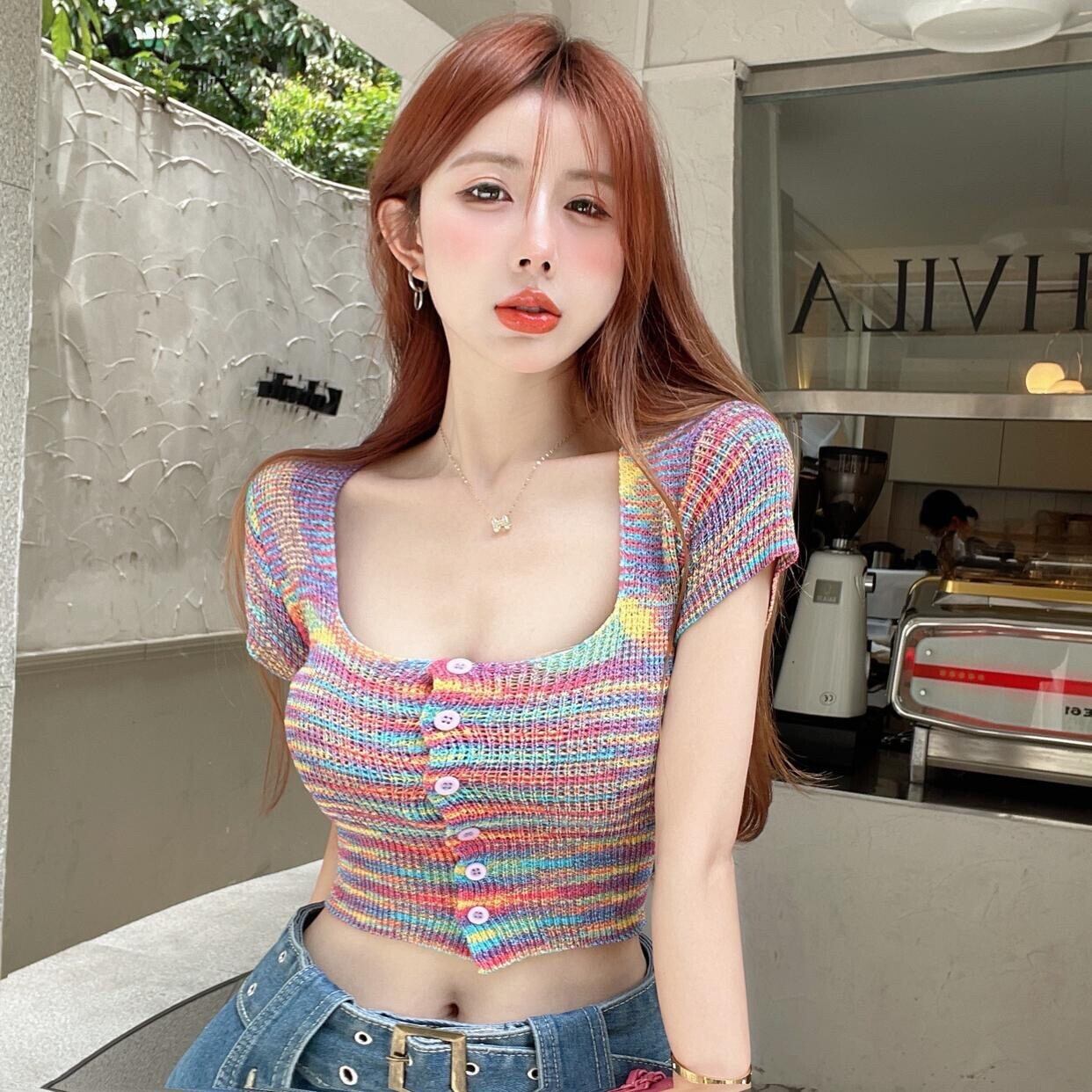 スクエアネックミックスカラーサマーニットクロップトップス TO-SHR700