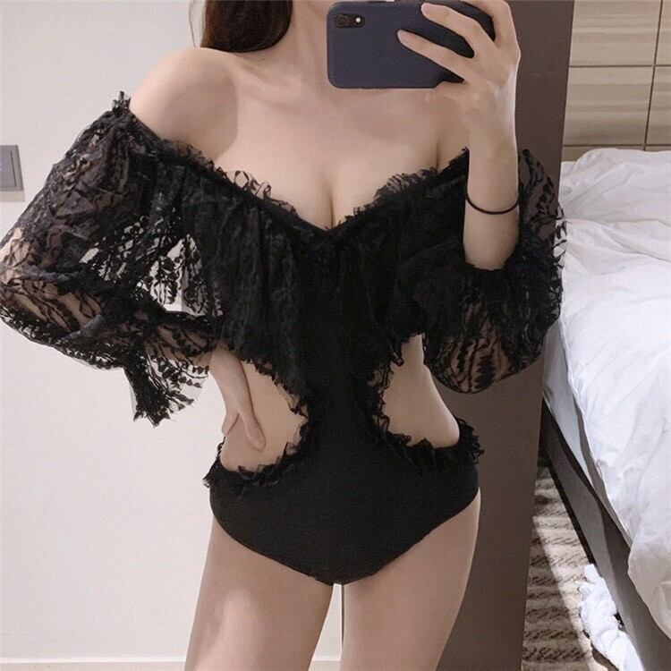 オフショルダーレースフリルレースアップウエストカットアウトワンピース水着 OTR-SWM-OP300