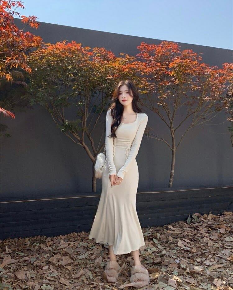 レースアップスリムラウンドネックロングワンピース 32M-ONE-083