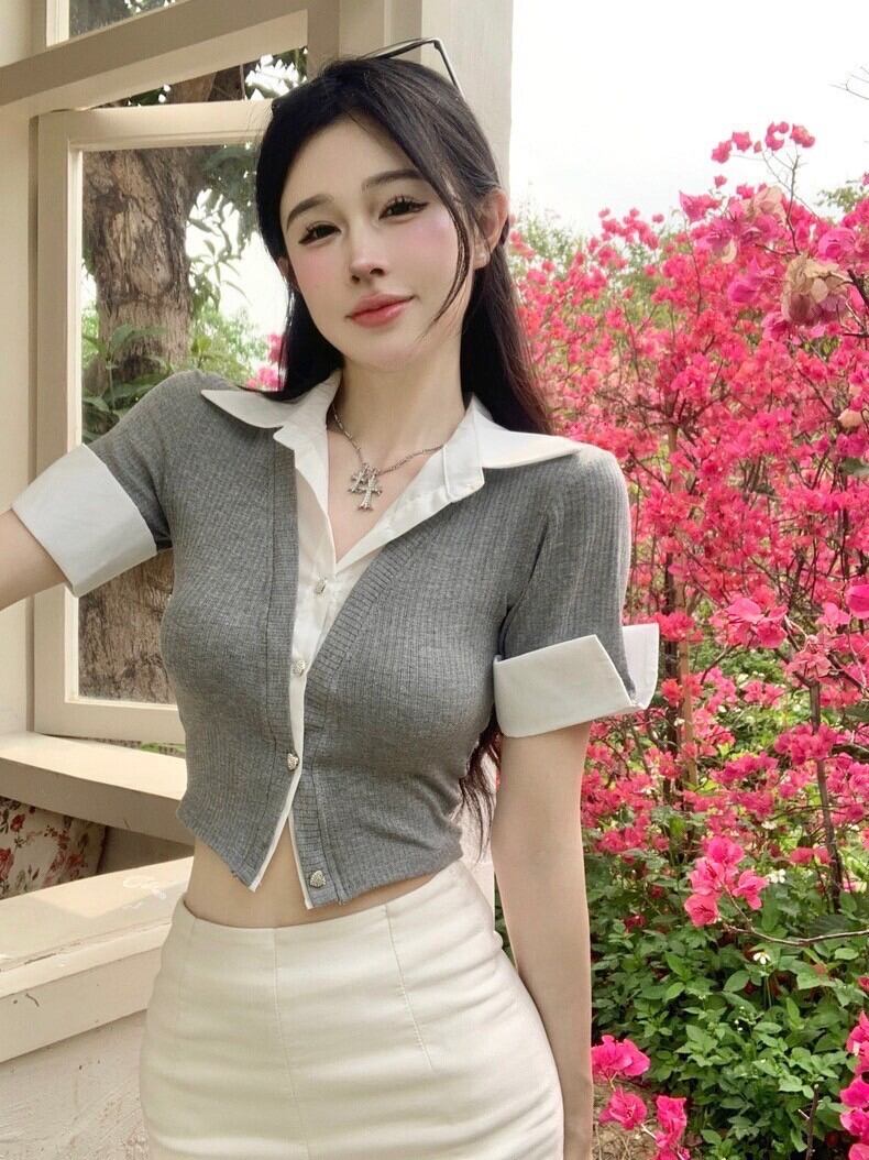 ハートボタンクロップフェイクシャツニット TO-SHR902