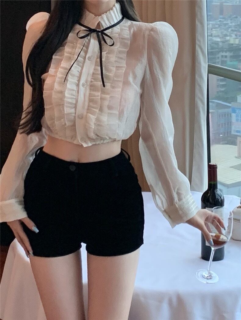 シアーフリルボウタイクロップブラウスブラックフィットショートパンツ セットアップ ST-SUP3100