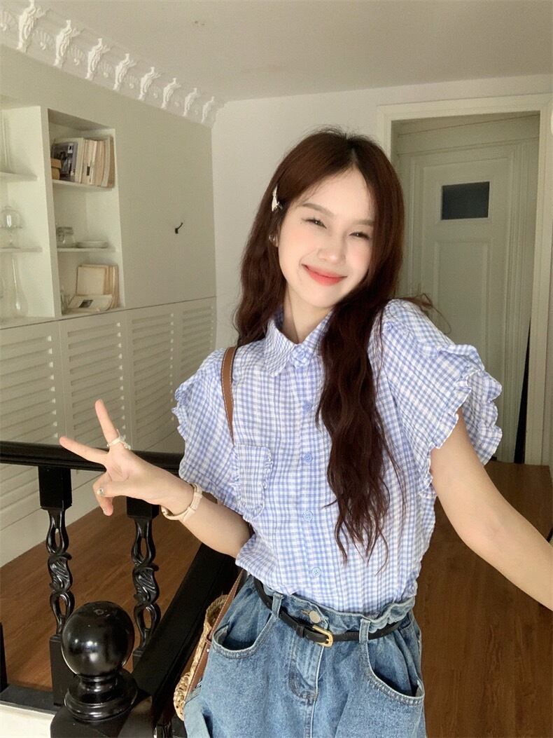 ブルーチェックフリルブラウス TO-BR2400