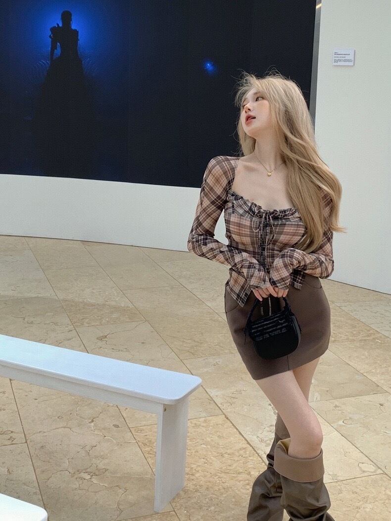 スクエアネックチェックフィットリボントップス TO-1100