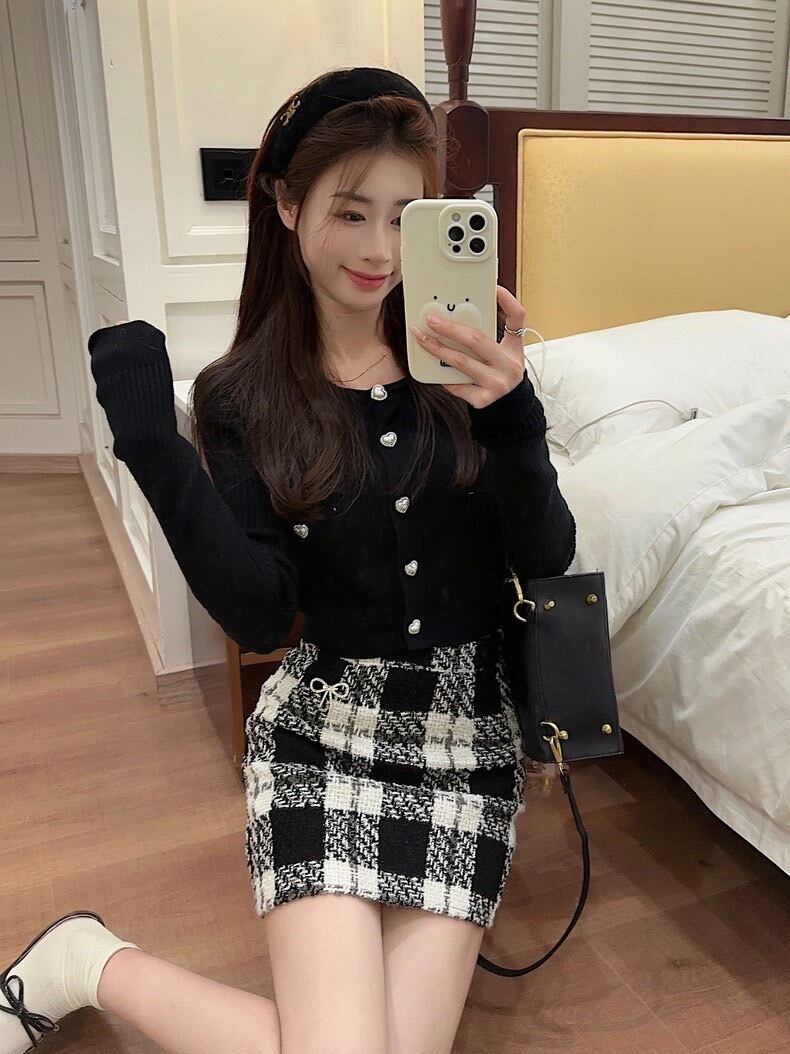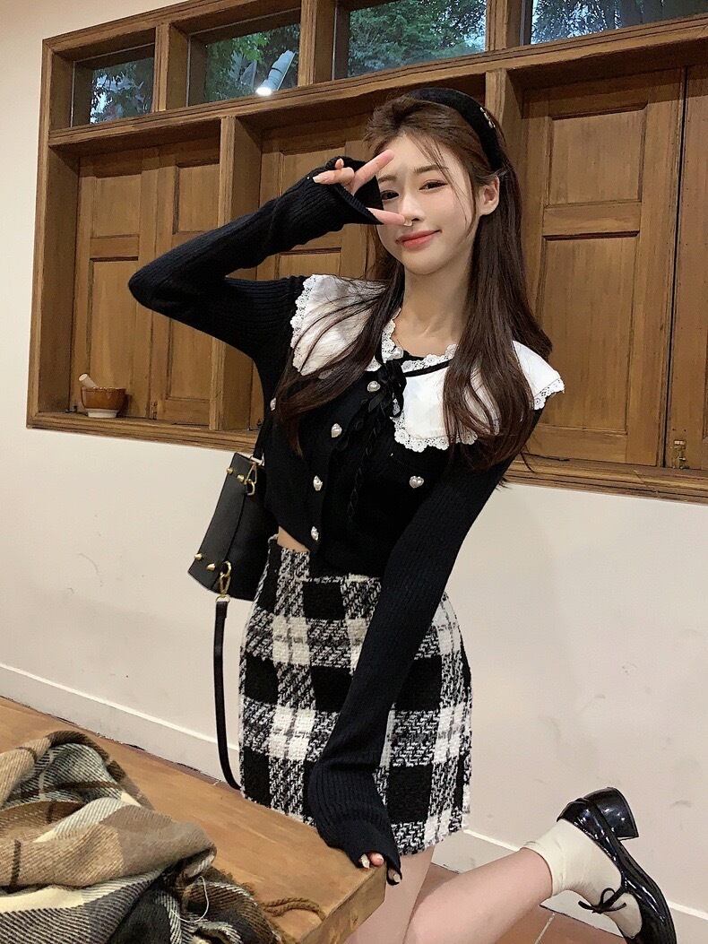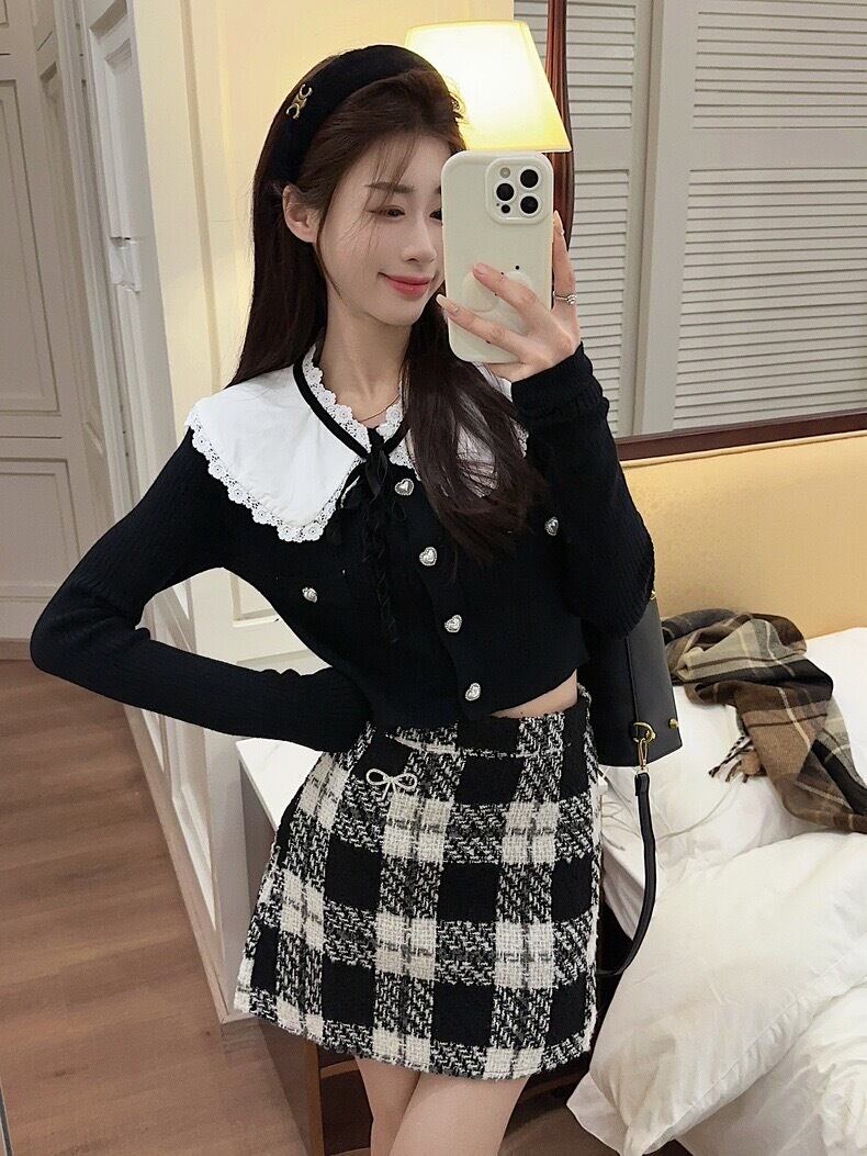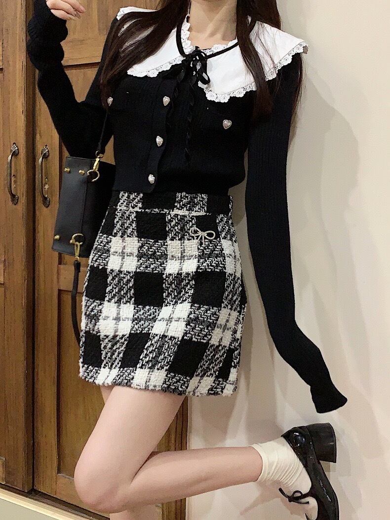 3点セット 襟付きフレンチクロップカーディガンモノクロチェックミニスカート ST-200