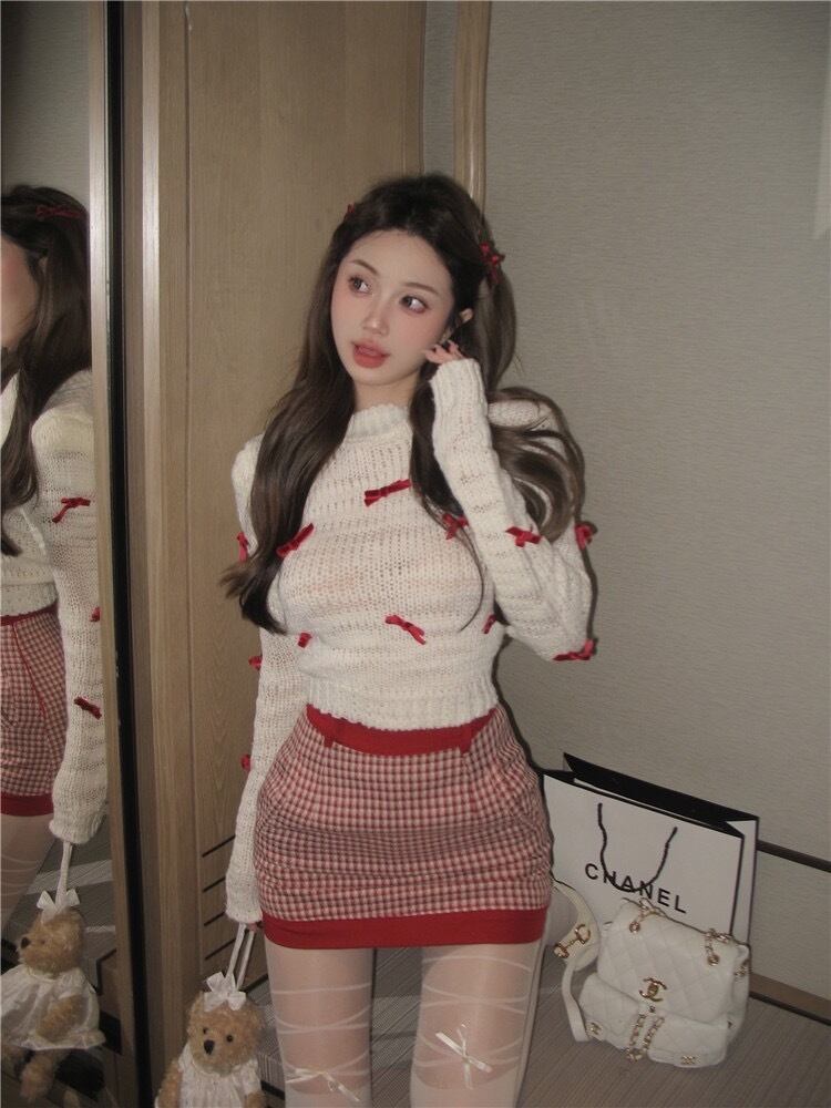 セットアップ【ホリデーカラーリボンニットチェックミニスカート セットアップ】または【ST-SUP5300】