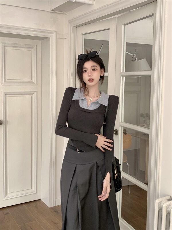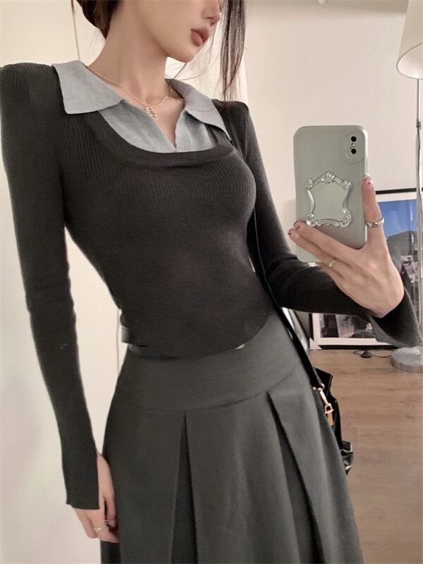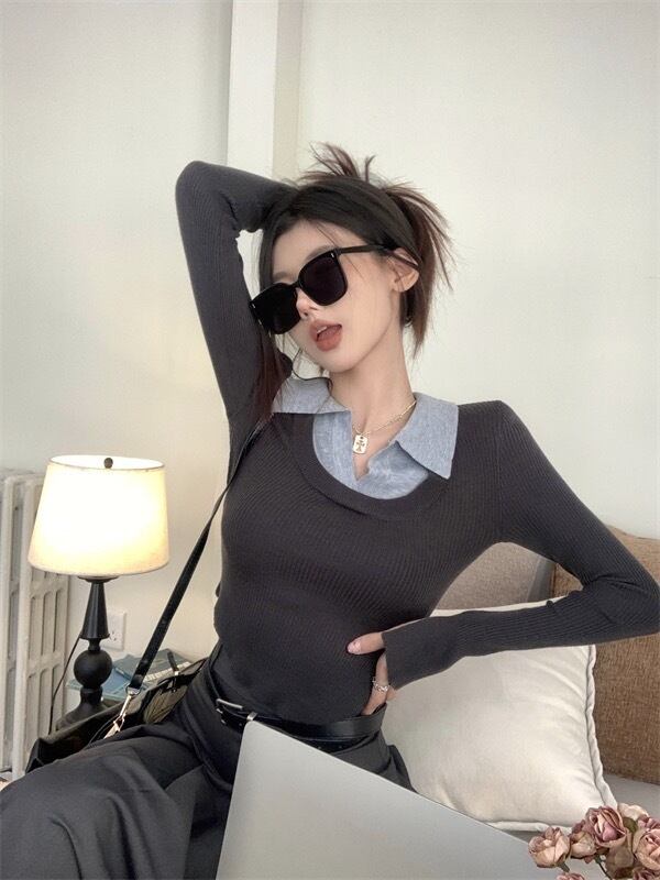 スリットスリーブシャツリブニットコンビネーショントップス TO-LNG4500