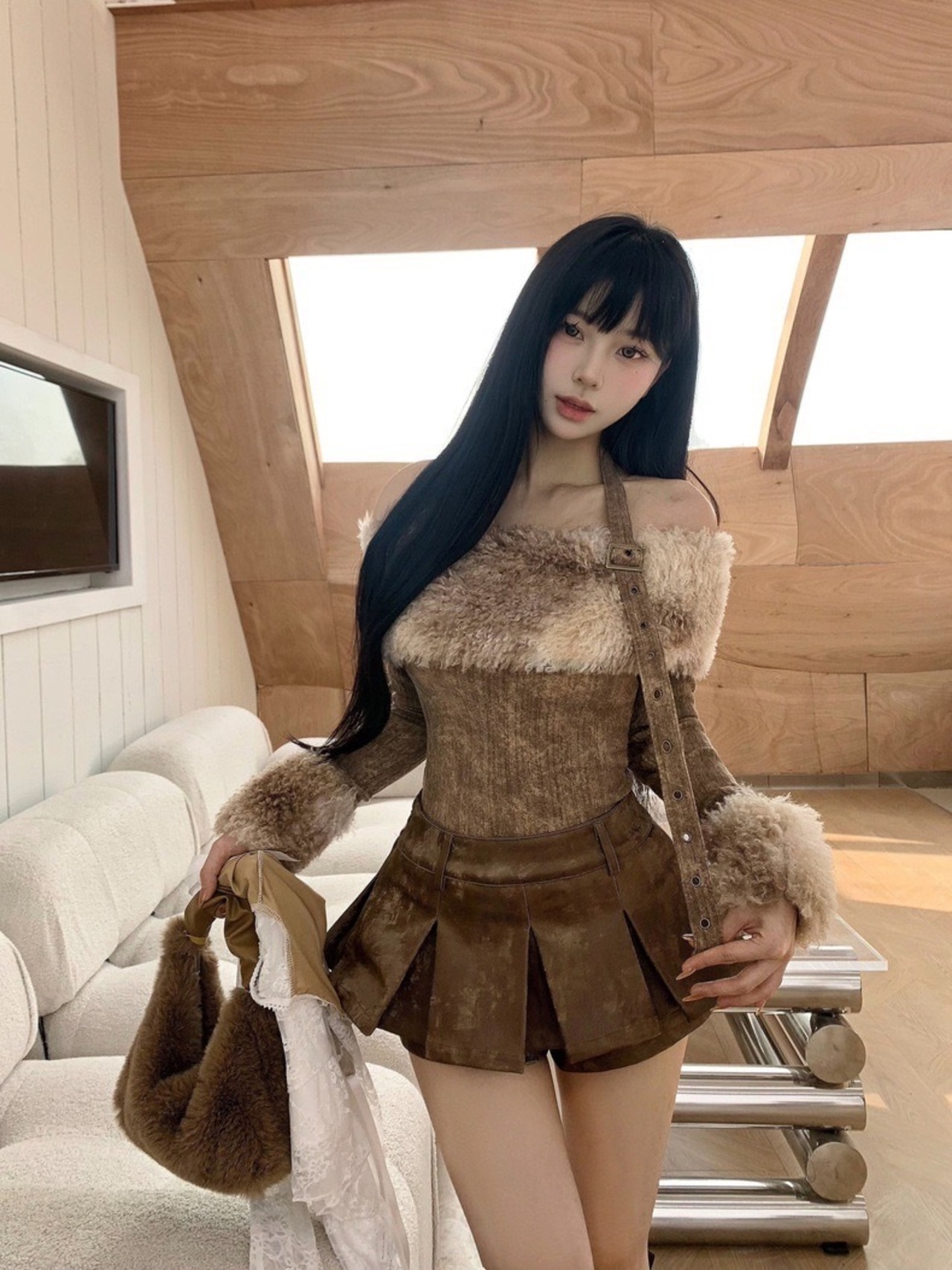 デザインボアオープンショルダープリーツミニスカパン セットアップ ST-SUP5700
