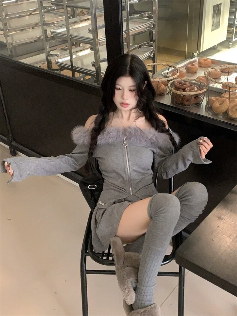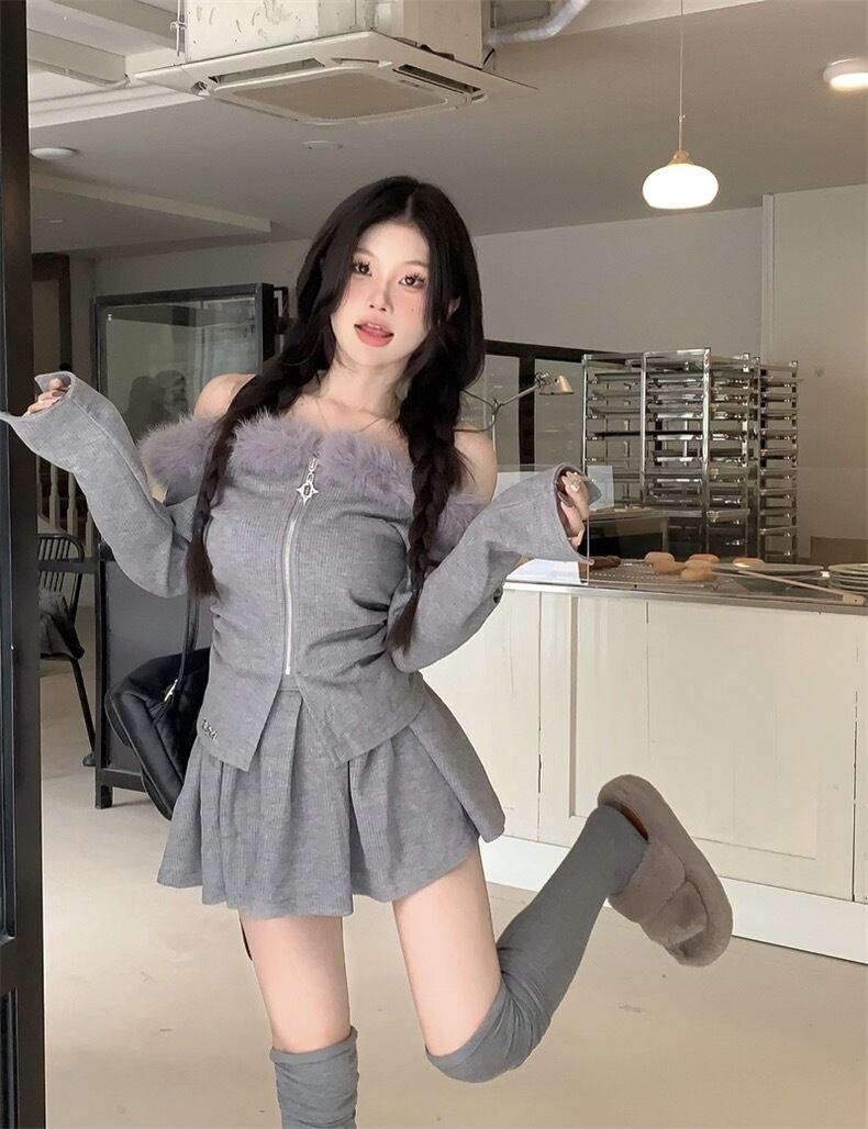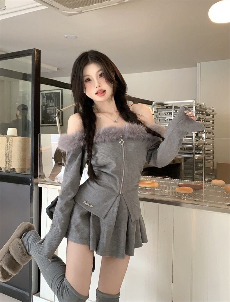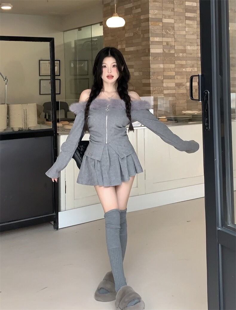 セットアップ【オフショルダーフルジップファートップスワンカラープリーツミニスカート セットアップ】または【または【TO-LNG6600】】